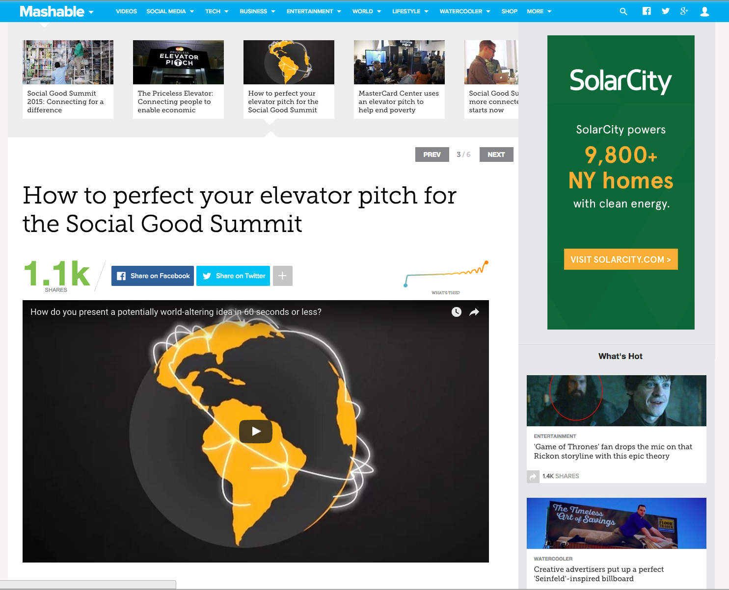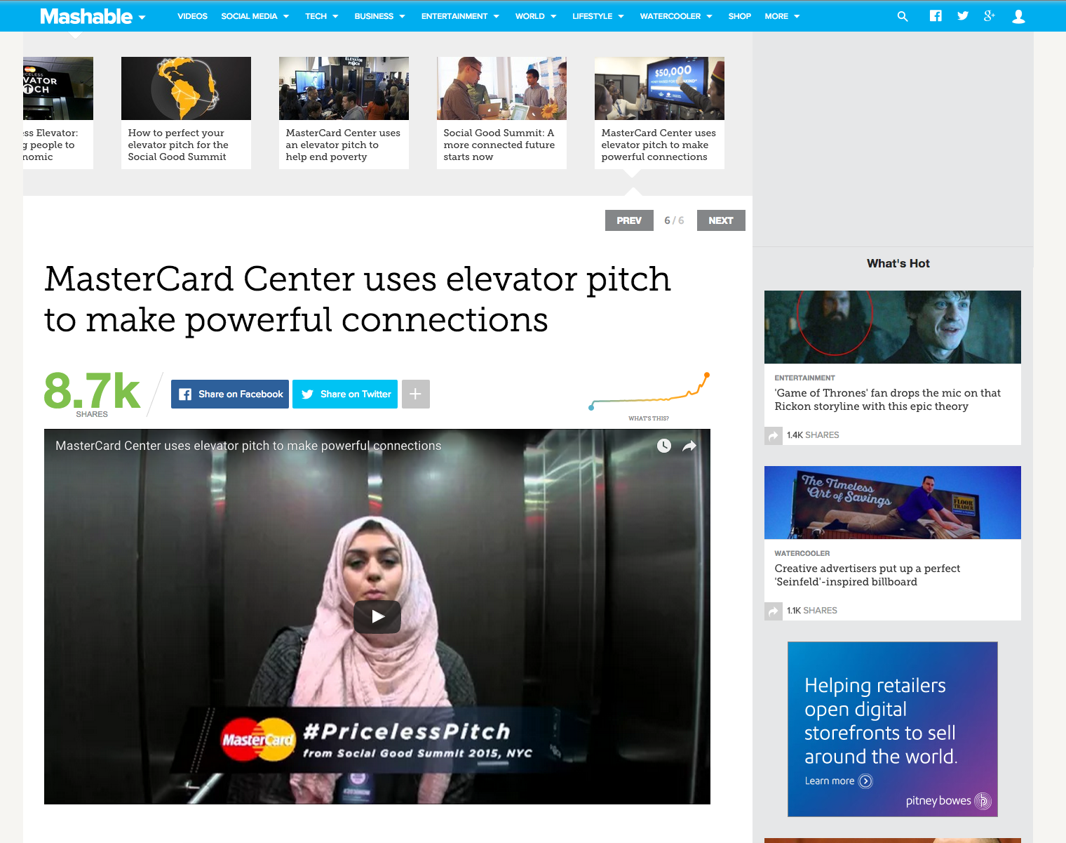 On September 27th & 28th at the annual Social Good Summit in NYC, the MasterCard Center for Inclusive Growth gave individuals and organizations the opportunity to give a pitch in an actual elevator. Participants had 60 seconds to answer the question: What are you doing to help end poverty and how can The Center help?